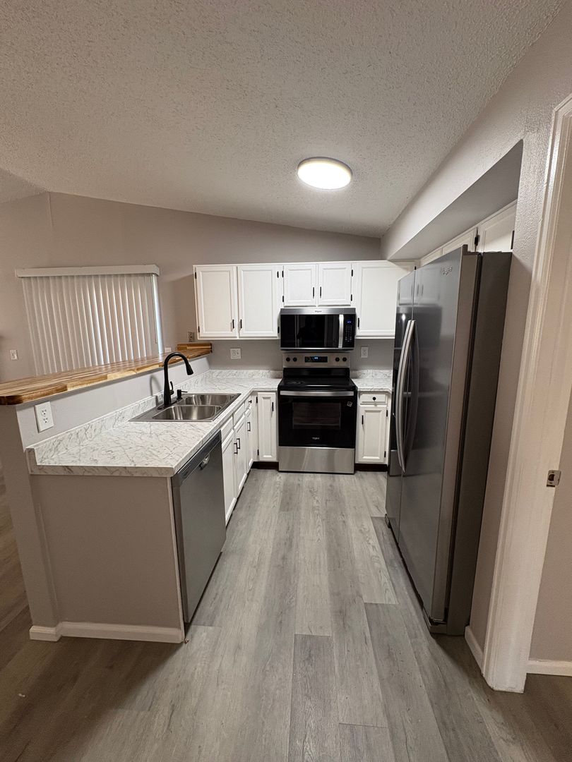 New remodeled inside and out!! Ranch style home with a finished basement. New LVP flooring throughout the main level. The front door leads you into an open concept living room, dining area and kitchen. Natural light brightens the area as it floods in from the sliding glass doors of the dining area. Beautiful, new countertops and a custom wooden bar top in the kitchen are complimented by crisp, white cabinets and all new appliances. All 3 bedrooms are on the main level and share a full bath. The finished basement has a huge family room, a laundry area with new washer and dryer, a full bath and a bonus room. The back yard is fully fenced in, with a small patio off of the dining area. Parking is a breeze with the 2 car garage, and wide driveway.
